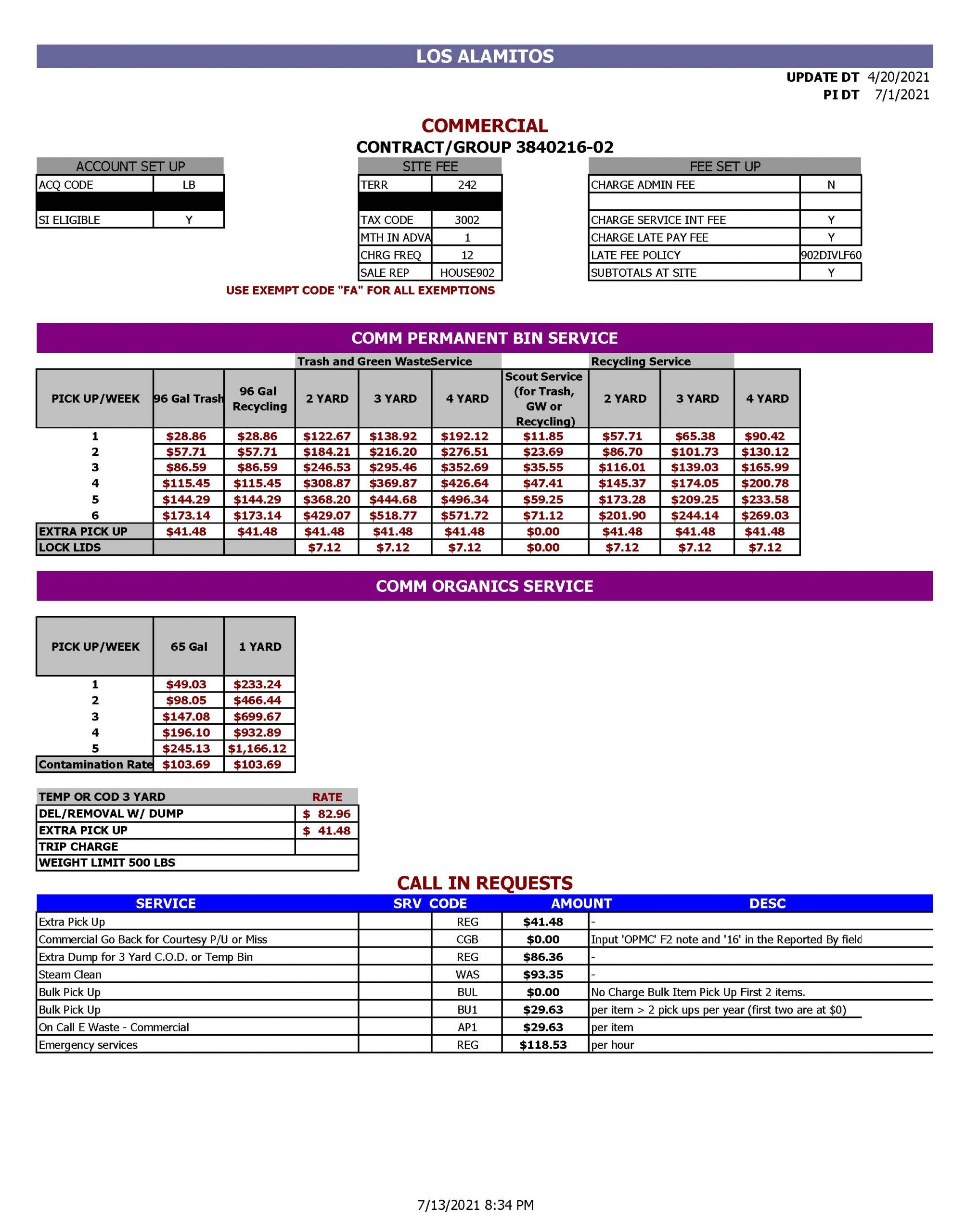 Commercial Trash Collection Rate Sheet, Effective July 1, 2021 (JPG)